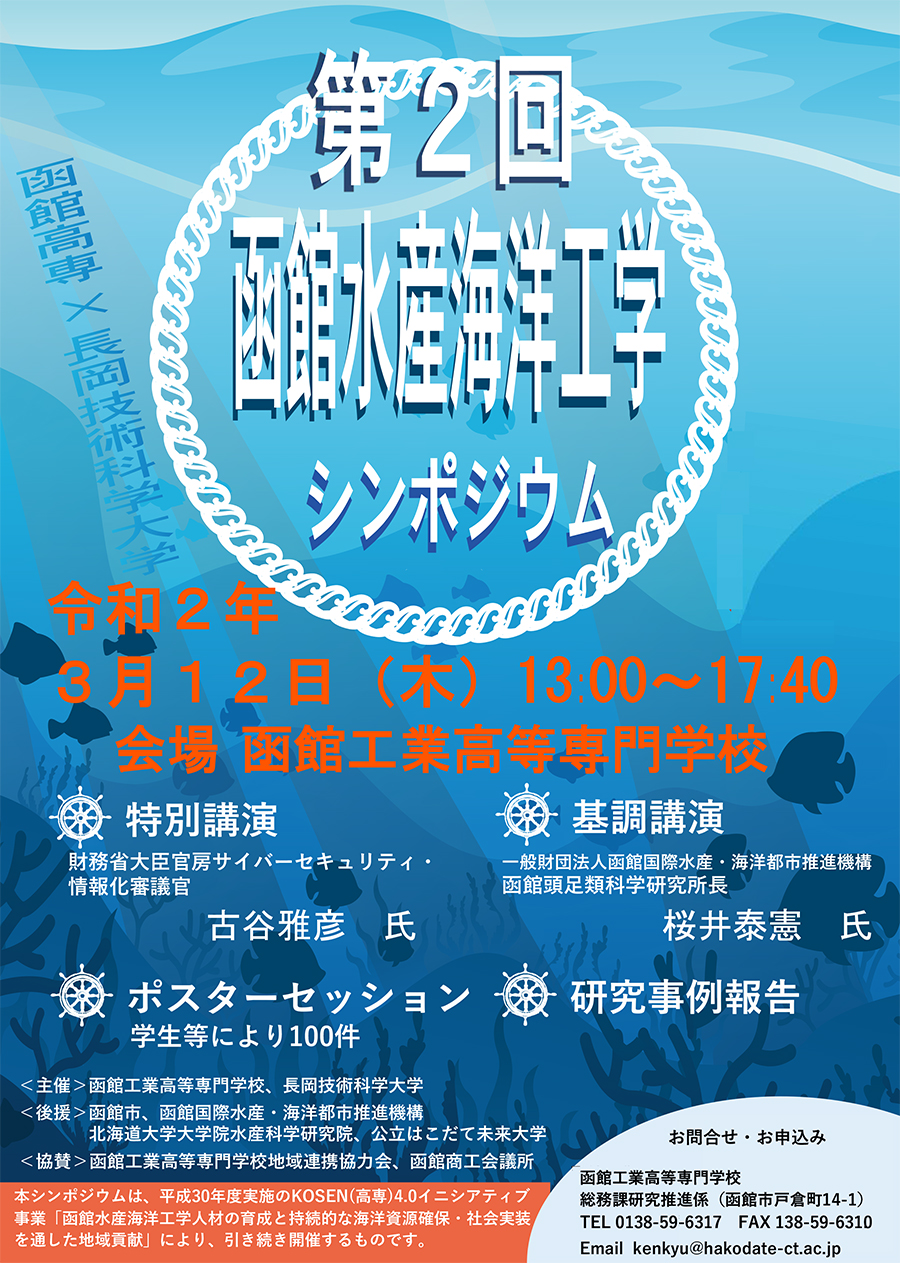 函館工業高等専門学校と長岡技術科学大学のコラボレーションによる「函館水産海洋工学シンポジウム」が、令和2年3月12日(木)に下記のとおり開催されます。