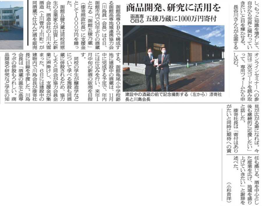 函館新聞 日本酒「五稜乃蔵」を支援 高専OBらが1000万円寄付