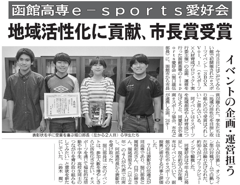 函館新聞 函館高専e-sports愛好会 地域活性化に貢献、市長賞受賞