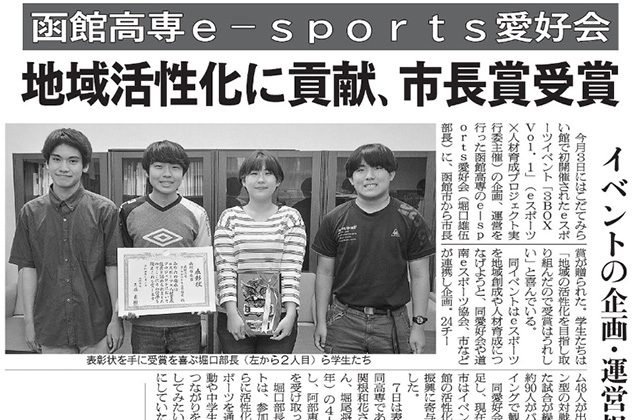 函館新聞 函館高専e-sports愛好会 地域活性化に貢献、市長賞受賞
